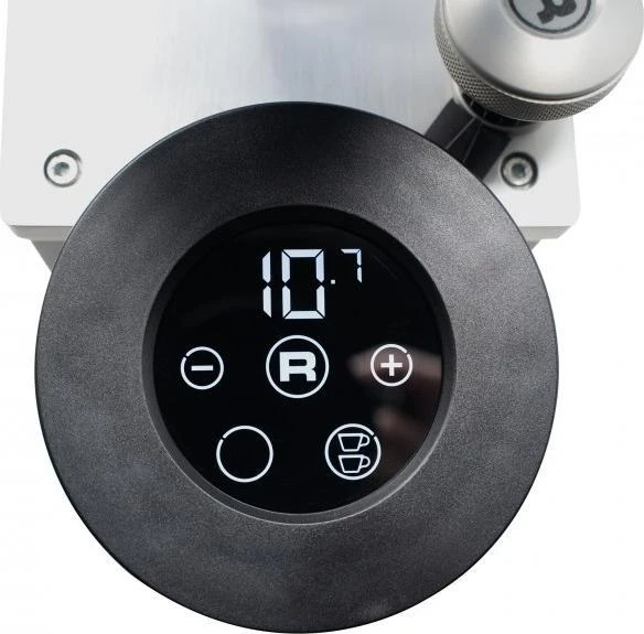 A small touchscreen display keeps everything neat and simple with the option to choose between a single dose, double dose, or manual dosing. Visually, the display has a clean design and all UI elements are arranged for easy reading. The pause feature lets you pause your grind or cancel it altogether with just a push of a button. Just leave the portafilter in the holder, press your desired amount, and watch the Faustino dispense fluffy grounds from the chute.